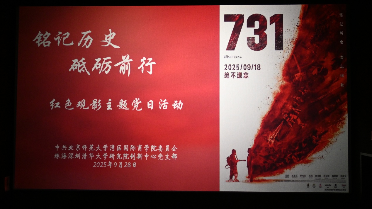 在纪念中国人民抗日战争暨世界反法西斯战争胜利80周年、喜迎中华人民共和国成立76周年之际,yl23455永利公司党委联合珠海深圳清华大学研究院创新中心党支部,于9月28日在格力海岸海上影城成功举办红色观影主题党日活动。50余名师生党员齐聚一堂,共同观看历史题材电影《731》,在光影叙事中重温峥嵘岁月,凝聚奋进力量。