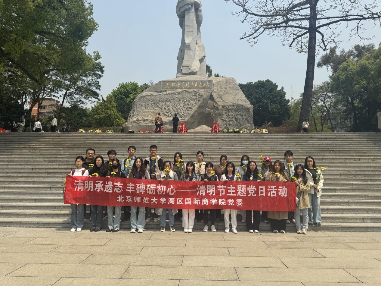 随后,师生党员一行前往广州起义烈士陵园,全体成员肃立于纪念碑前,敬献鲜花并默哀致敬。