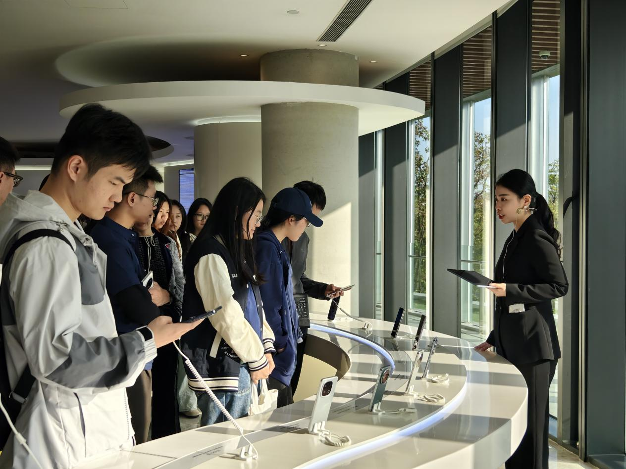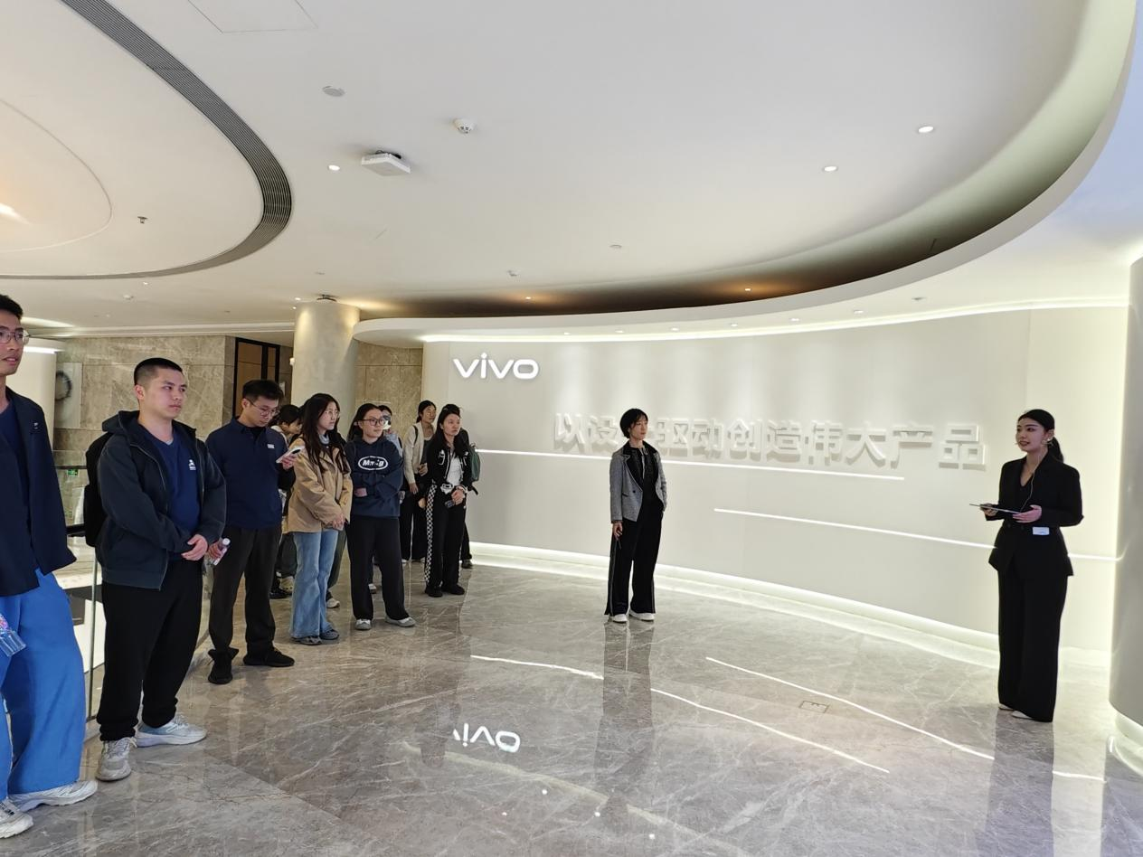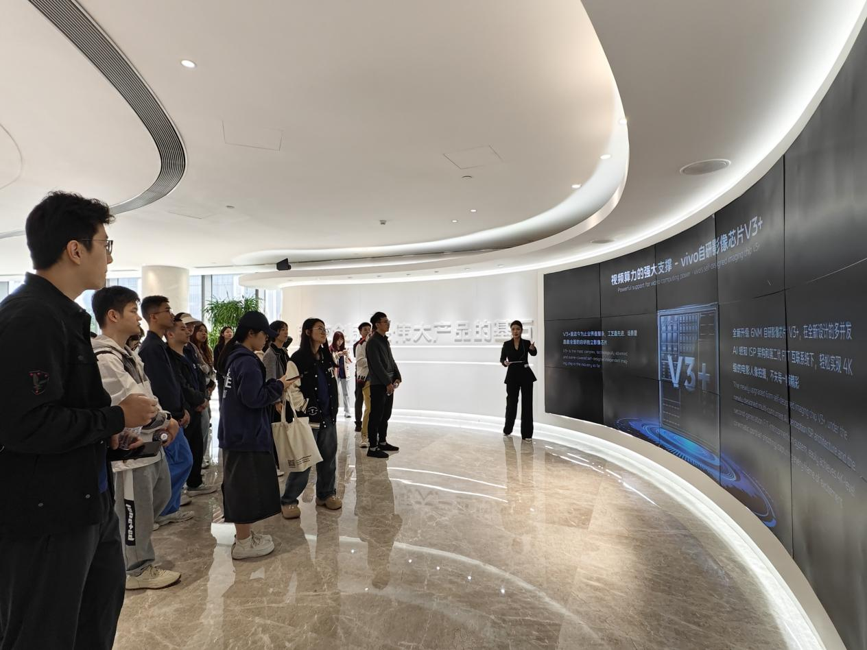结束生产车间的参观后,在工作人员的悉心引导下,公司师生踏入了VIVO的品牌展厅。工作人员以详实且深入的讲解,全方位地呈现了VIVO的企业文化、发展历程以及发展战略,让师生们对VIVO有了更为全面而深刻的认知。作为一家以设计驱动创造伟大产品,以智能终端和智慧服务为核心的科技公司,VIVO始终坚定不移地秉持用户导向理念,持续加大产品与技术创新投入,矢志不渝地为消费者缔造更为优质、便捷的智能生活全新体验。
